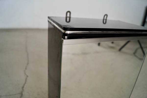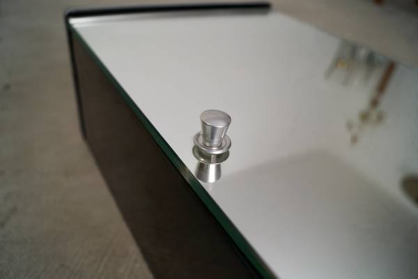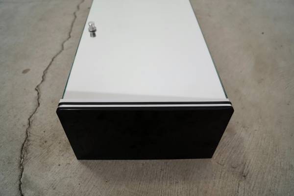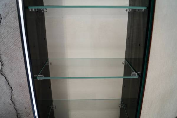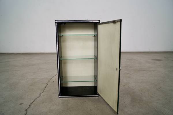Vintage Italian wall cabinet for sale. Has a mirror glass door that opens up to three adjustable glass shelves. Very solid and well made and in excellent condition. Has a black lacquered design with aluminum and chrome trims through. Original vintage knob. Very nice piece that is functional and mounts to the wall. The measurements are 18 3/4" tall x 10 1/2" wide x 6" deep.