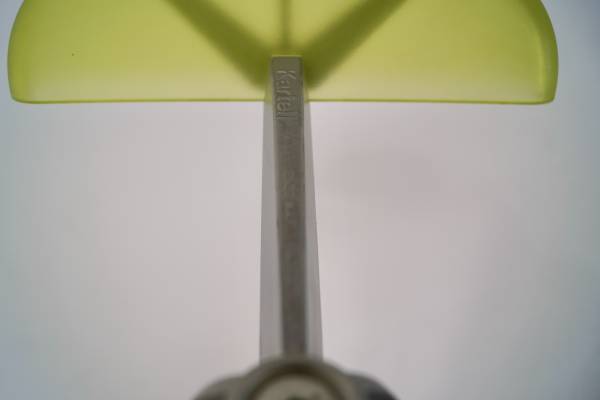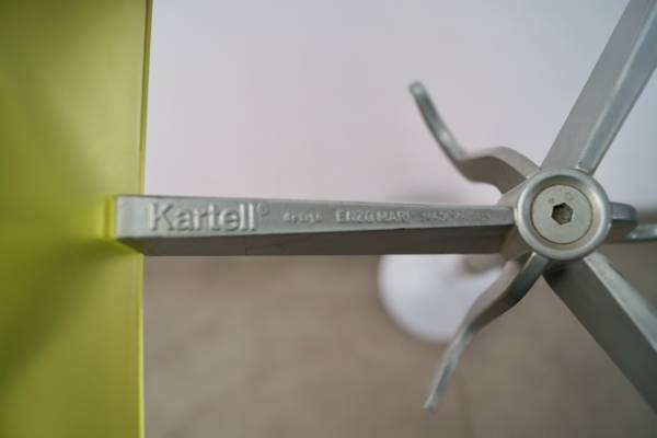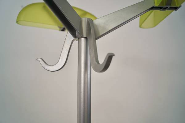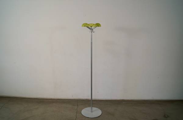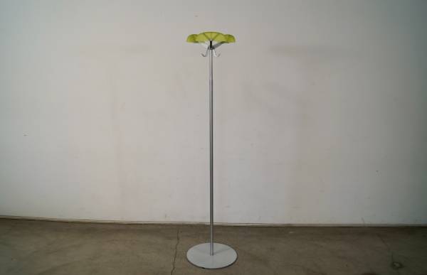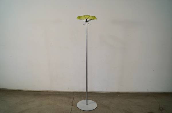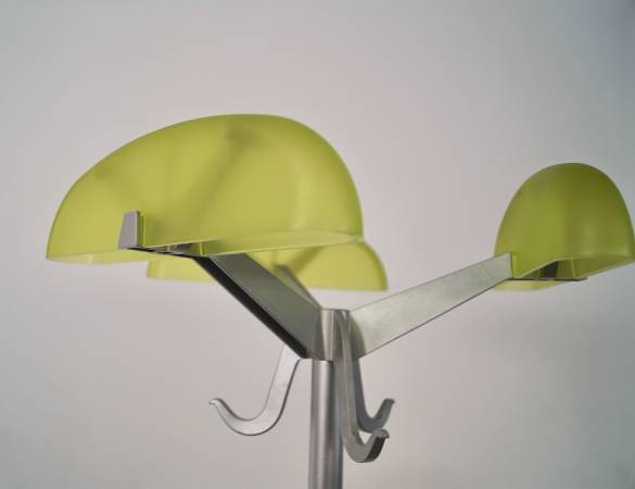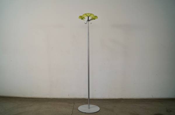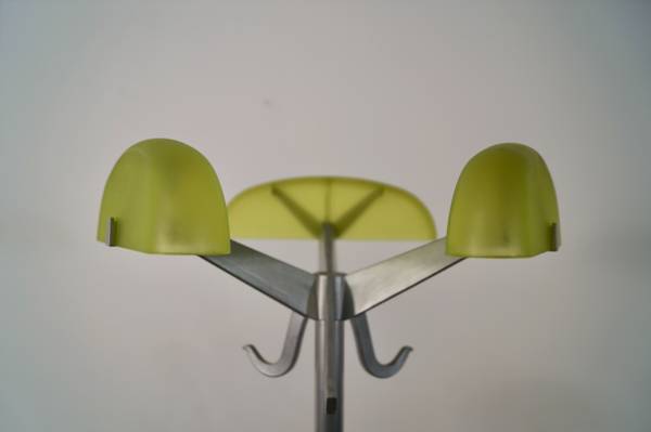 Vintage Post Modern coat rack for sale. Designed by Enzo Mari in 1995, and made in Italy. It was manufactured by Kartell, and has the brand and designed engraved in the metal. This is the Alta Tensione coat rack, and is made of steel, cast aluminum, and acrylic in citrus yellow. It has three hooks, and three citrus yellow clothes caps. It's a great item to decorate, and adds great color to a space. It's solid and well made like anything from Kartell. It's in good condition. The measurements are 67" tall x 15 3/4" diameter.