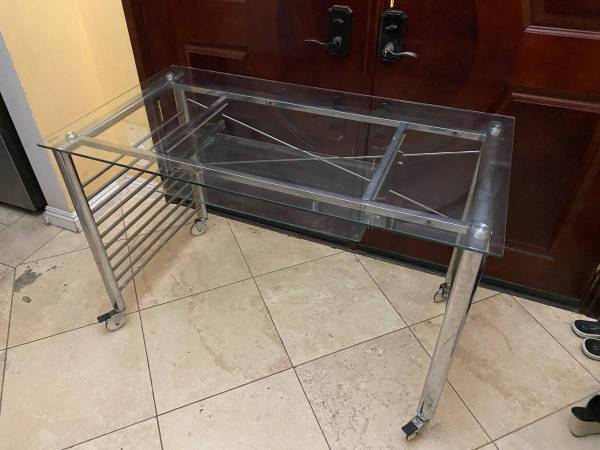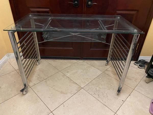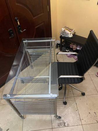 leather ribbed high back chair in excellent condition. It measures 42.5" high and 24" deep and wide. Plus nice rolling glass desk with slide out keyboard that cost $695 + tax + shipping.