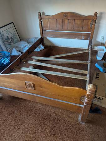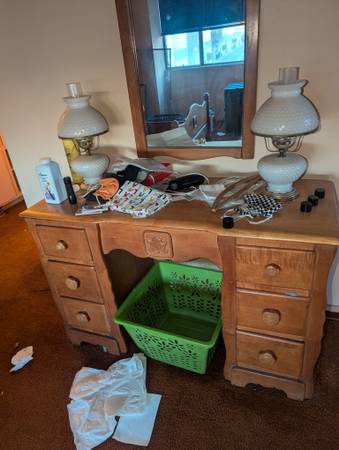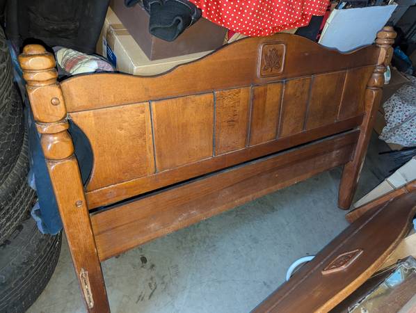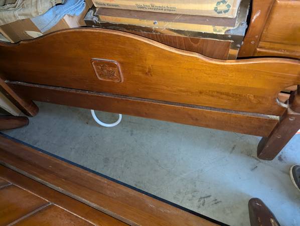 Mid-Century modern Virginia House Maple Leaf, hard rock maple furniture. Desk, mirror, rocking chair, bed. All in good condition. • Bed head/footboard/frame $450 • Vanity desk $250 • Mirror $125 •...