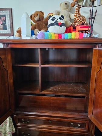 Its clean outside and all the drawers are clean only in one shelf there is a little discoloration because of the sticker.its clean. Size 59 h/40 w / 17 d Inside you can remove the shelves if you...
