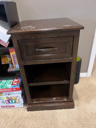 Selling custom made bedroom furniture. Full size bed frame with two drawers. (not mattress). Tall matching book shelf, nightstand and chest of drawers.