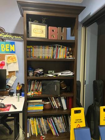 One of the round designs on footboard just needs to be fixed with sanding and placed back on the foot post. Bookshelf has adjustable shelves. All solid wood.
