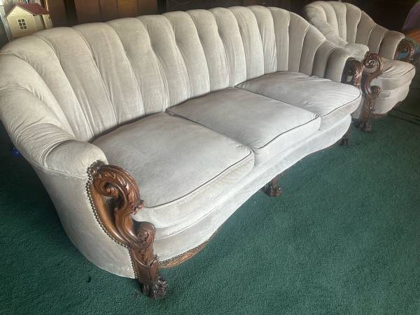 Gorgeous antique sofa and chair set / rolled arm sofa and chair. Gray velvet upholestery. No stains or signs of wear. Smoke and pet free home. Solid carved wood arms and bottom trim with clawfoot...