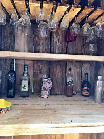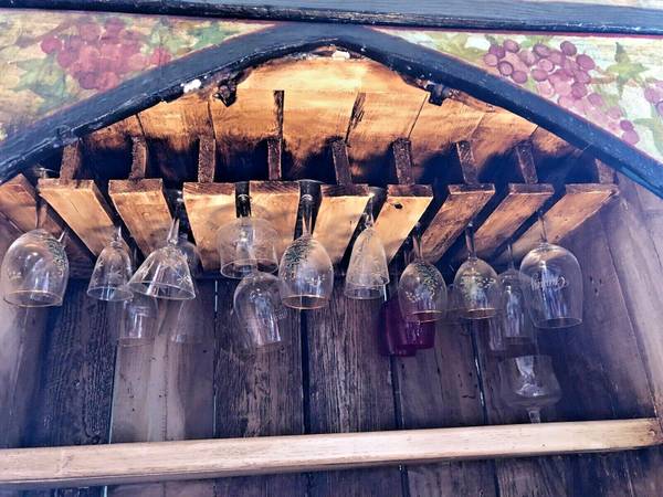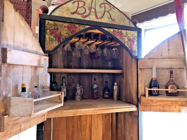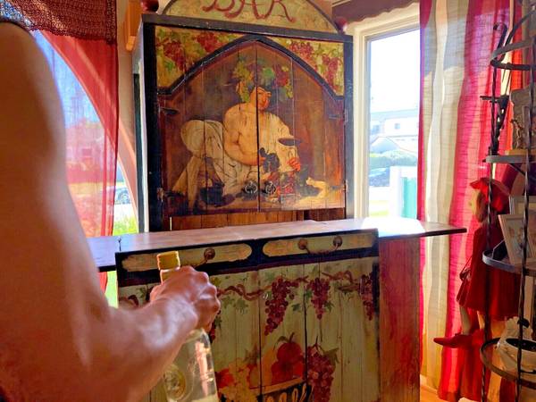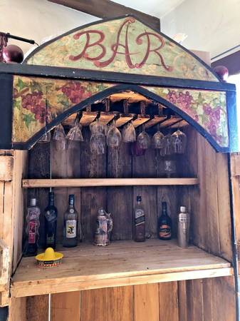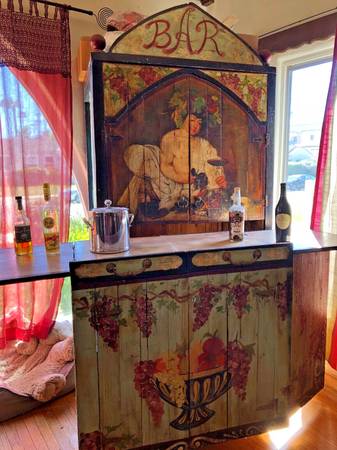 This is a one of a kind, custom made bar. It has in the top the picture of Bacchus the Roman God of Wine and on the bottom part a basket full of grapes. Hand painted and decorated. The cool part is that the bottom section can be rolled out and it becomes a bar while the rest can store bottles and glasses. Perfect for parties at home or in restaurants. It has wheels on the bottom so it can be easily moved. There is no other one like this.