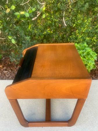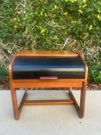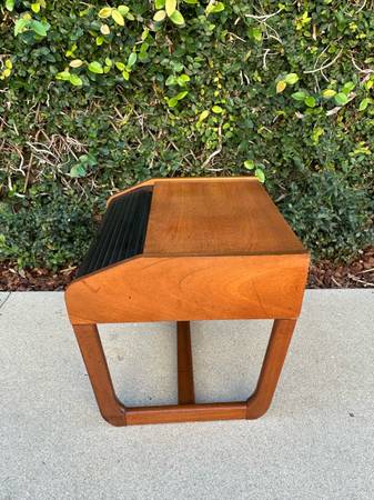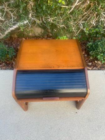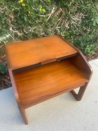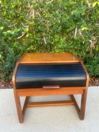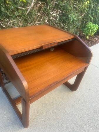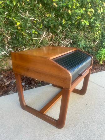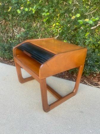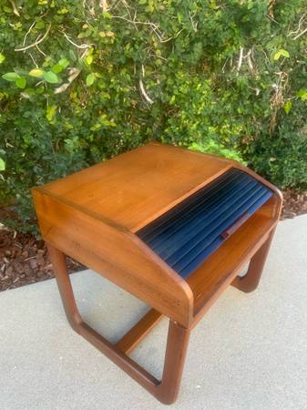 This elegant 1960s cube-shaped end table features a smooth roll-top tambour door that glides open to reveal a convenient storage compartment. Its distinctive design makes it a true conversation piece. Beautifully crafted and imported from the UK.