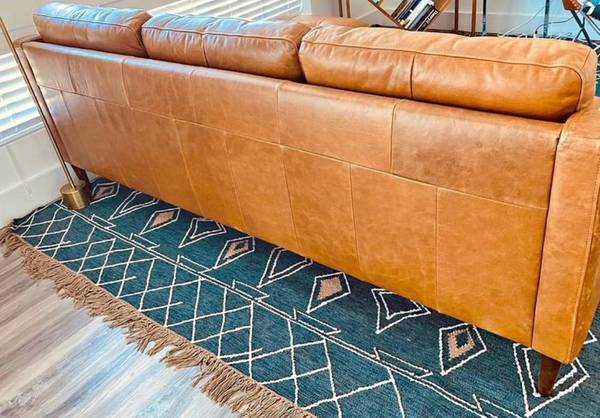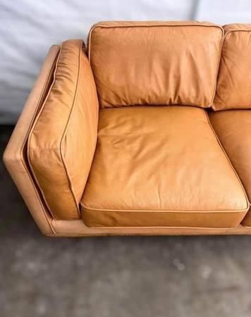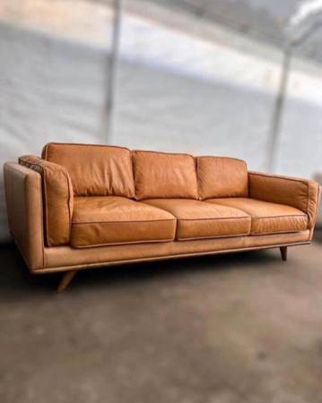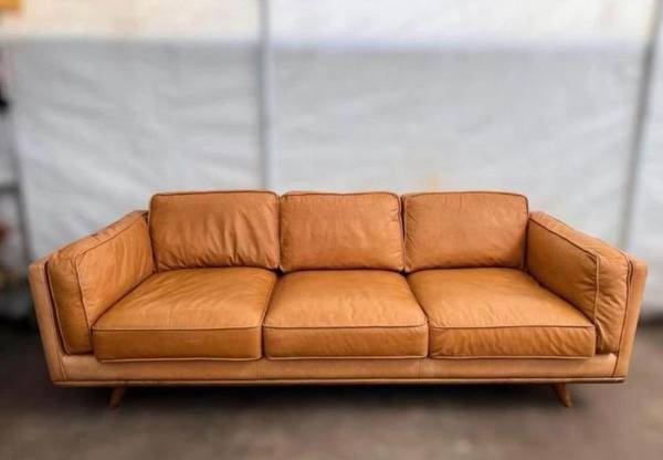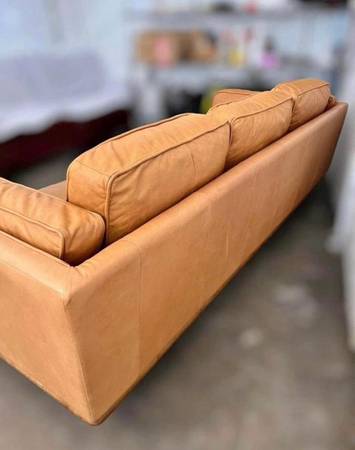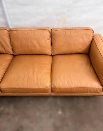 All removable cushions and solid oak wood base and legs. Still in perfect condition, Leather is genuine.