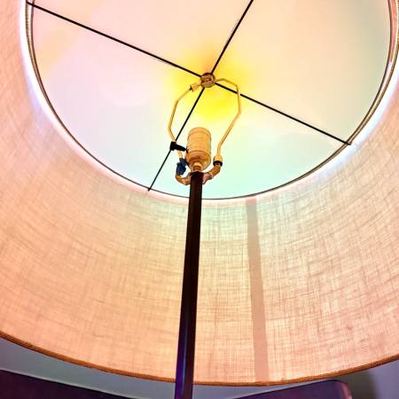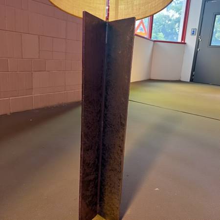 Sculptural blackened-steel floor lamp stands as a true one-of-a-kind statement piece — more architectural object than traditional lighting. Its star-form column and rich patinated finish give it a commanding presence, while the oversized shade casts warm, atmospheric light that elevates any space. Perfect for collectors and design-forward interiors seeking a piece with depth, texture, and character.
