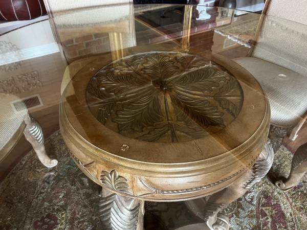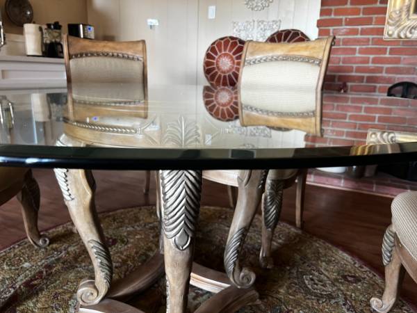 Beautiful round beveled glass round table in good condition. Sits on a separate elegant carved honey-colored wood base. Neither glass nor base have any major damage, minor scratches only. Matching 6 chairs are free if the buyer wants them, fabric has some stains that need to be treated but otherwise chairs are in good condition. Round Persian rug for sale separately for $85.