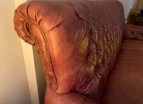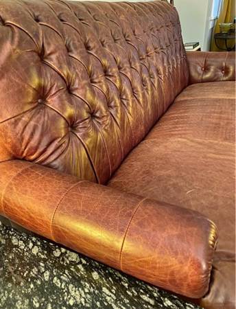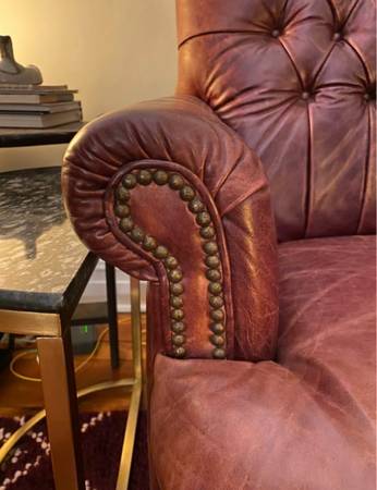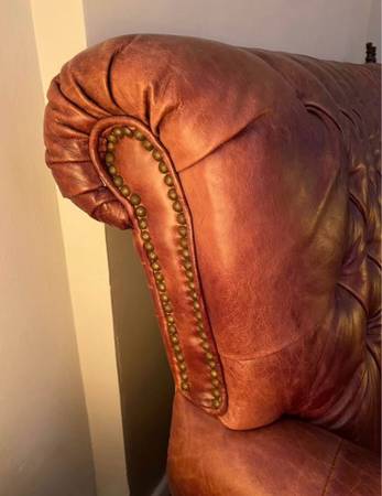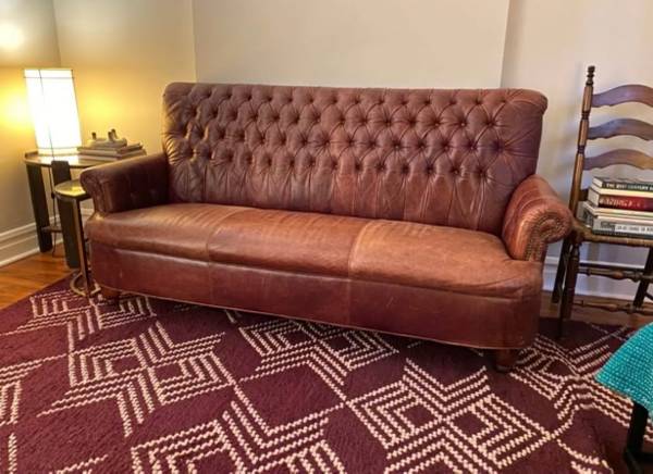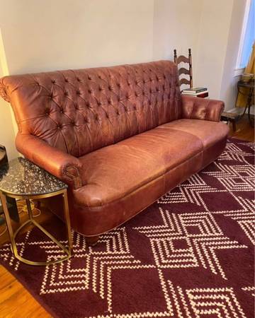 Classic Chesterfield-style high back sofa crafted from genuine leather. Deep button tufting, rolled arms. The leather is well-maintained — no rips, or tears. It was used in the speak easy room of our previous home. Our new place is much smaller and we have to forego this couch.