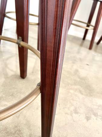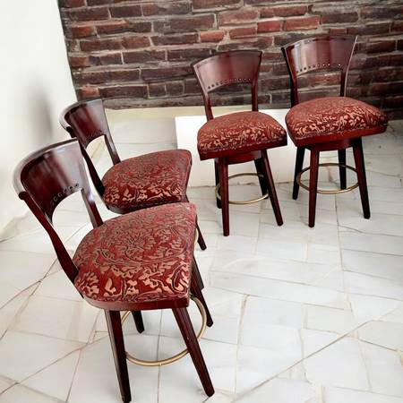 Add a touch of vintage charm and sophistication to your bar or kitchen with this set of four swivel barstools. With rich wood tones, luxurious fabric, and classic detailing, these barstools offer both style and comfort. Made from a high end furniture quality in North Carolina.