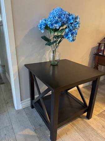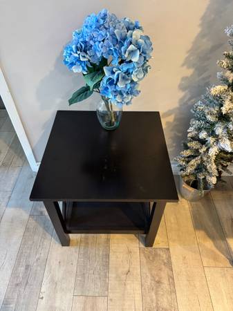 Super sturdy dark wood end table. It measures 22 inches deep by 22 inches wide by 21 1/2 inches tall. Asking $30 but will take best offer. Feel free to take a look at my other items that I have...