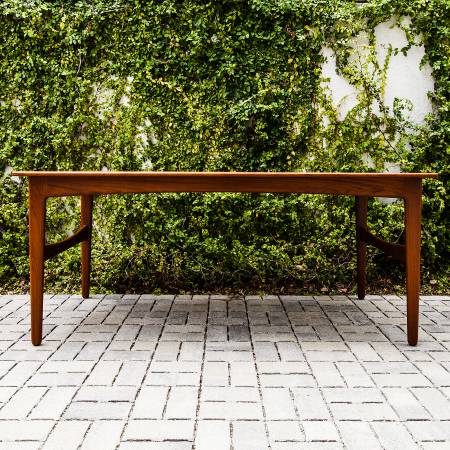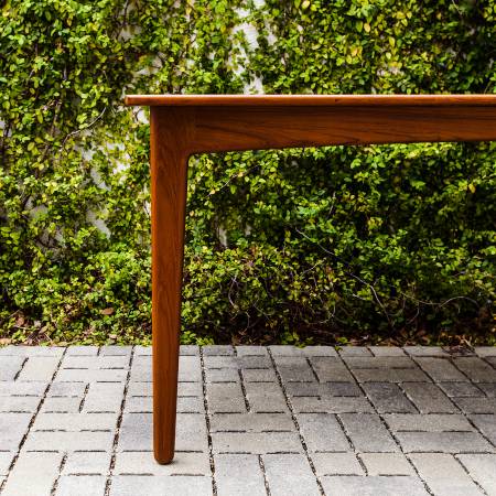 Refinished teak dining table by Knud Andersen for J.C.A. Jensen with original placard from storied Danish retailer Illums Bolighus, date stamped 1962.