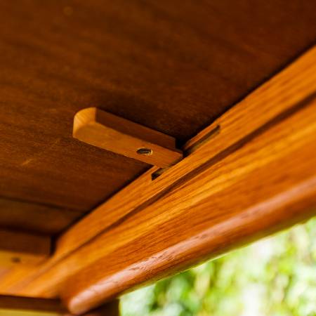 Two leaves stow beneath the main surface in notched trays which slide out and double as the leaf supports. Wooden turn-to-lock mechanisms on the underside of the leaves lock the leaves in place for regular use. Fully expanded the table reaches 113.5 inches, accommodating 10 guests with ease.