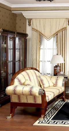 Add timeless style and comfort to your home with this stunning loveseat. Solid mahogany wood frame with carved details Luxurious striped cream & red upholstery Comfortable plush cushions with...