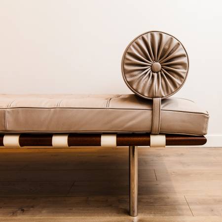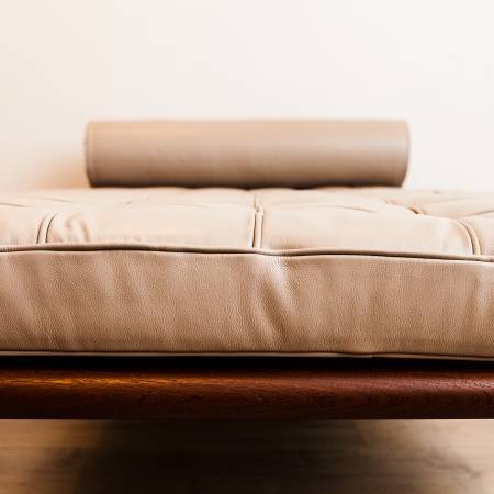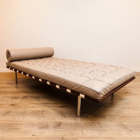 Authentic Barcelona Couch / Daybed, designed by Ludwig Mies van der Rohe in 1930 and produced by Knoll in the 2000s, with a Knoll tag on the upholstery backing and imprint on one of the legs. In a testament to the timelessness of the design, the Barcelona Daybed remains perfectly at home among contemporary and mid century modern design.