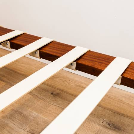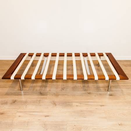 The frame has been fully refinished. The mattress and pillow have been fully reupholstered in Edelman leather, with new foam cushions to ensure decades of use. The off-white leather support straps are original. The chrome legs and support braces are free of imperfections.