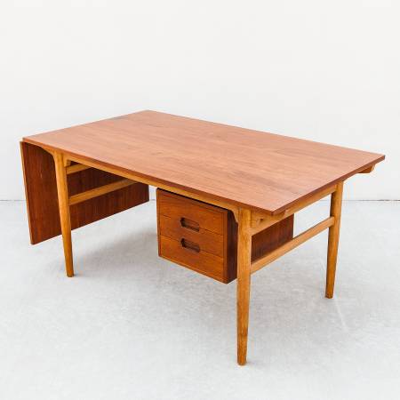 Large Scandinavian mid century modern teak and oak drop leaf desk, made in Denmark c. 1960s. Features a solid oak frame that supports a 57 inch teak desktop, a dovetailed drawer module, and an extension that adds over 20 inches when deployed — ample space to support a modern workstation. The extension is removable when not in use.