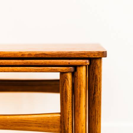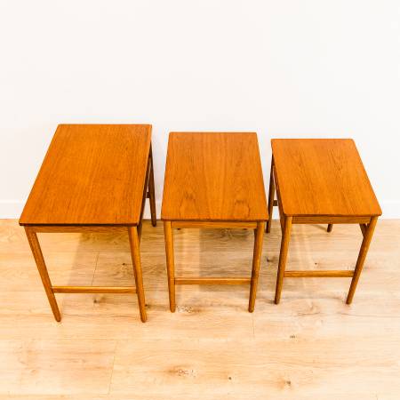 Expertly restored set of three nesting tables by Hans Wegner, produced in Denmark by Andreas Tuck in the 1950s. Perfectly simple, with softly rounded edges, tapered legs, and bowtie stretcher bars. The combination of teak and oak construction makes for a beautiful two-tone look.