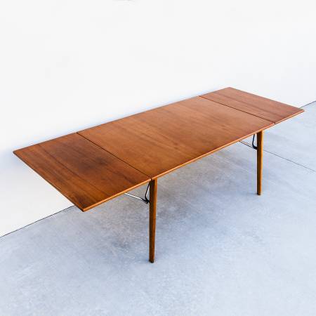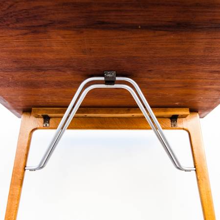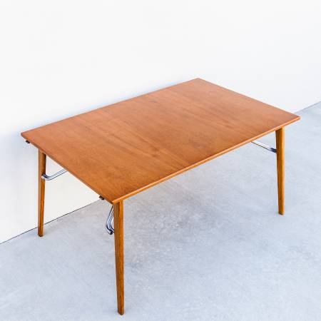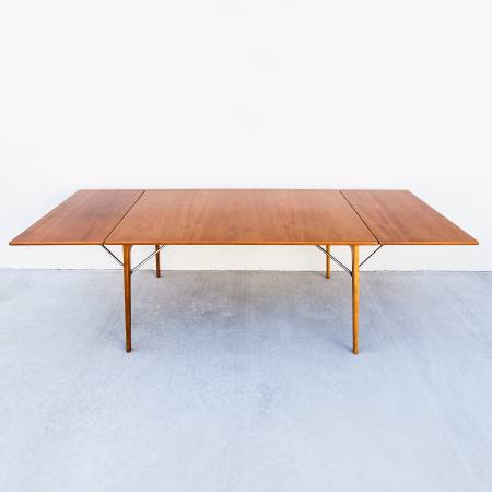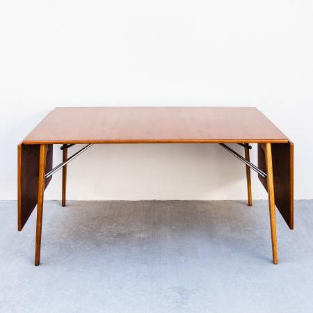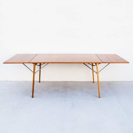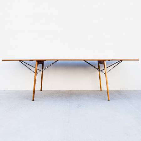 Perhaps in response to Hans Wegner's iconic Sabre Leg dining table, Mogensen's 162 employs a novel leg assembly and an innovative support system for the two included leaves. The chrome-plated steel braces, which stow underneath the main surface when not in use, unfold and clip into the leaves to support the table in its expanded form. With the leaves deployed 10 guests can gather around the table comfortably.
