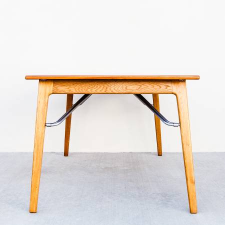 The teak surface sits atop a pair of tapered A-frame legs, crafted from solid oak. This combination of materials makes for a beautiful color contrast and was fairly commonplace in the 1950s and 1960s works of Hans Wegner, Torben Strandgaard, and Mogensen himself.
