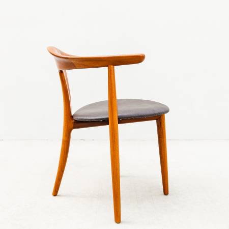 Made by Randers in Denmark in the late 1950s, the chair is constructed from solid old growth teak with a signature three bar rosewood inlay that Petersen & Andersen included in their side chair design as well.