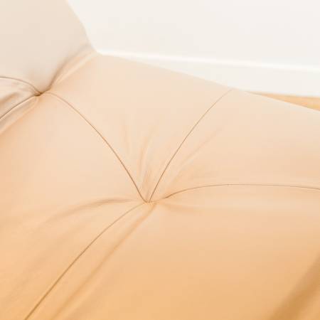 The straps were refashioned from saddle leather and the cushions have been reupholstered in a pebble gray leather from Edelman.