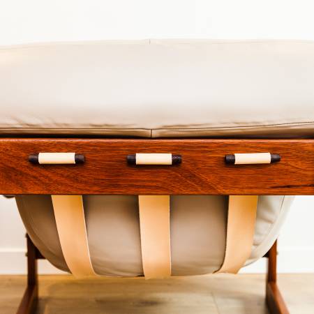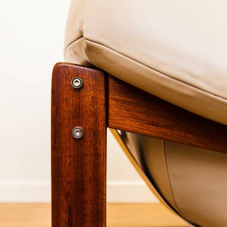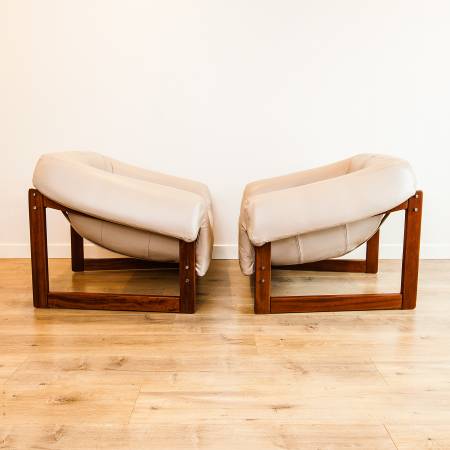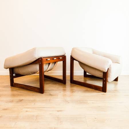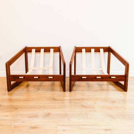 This pair was in need of a full overhaul when we acquired it. We disassembled the frames and reconstructed them joint by joint. We refinished the frames with neither stain nor toner to let the warm color of the jatoba wood shine through — factory finish on most Lafer models involved a ton of added color, to the extent that the woodgrain was muted almost completely.