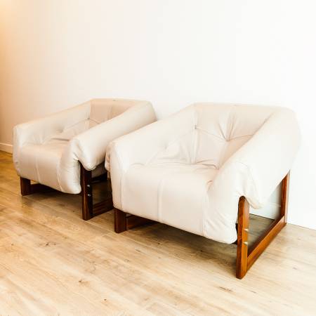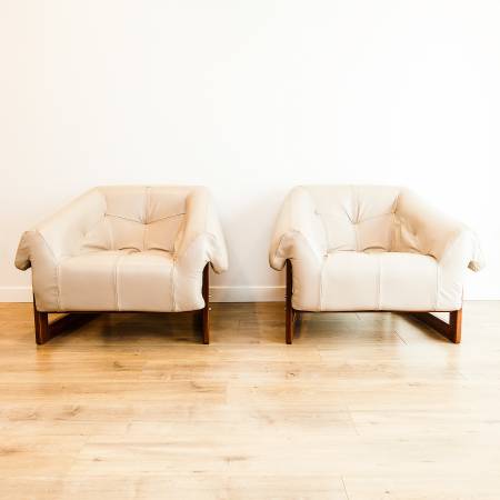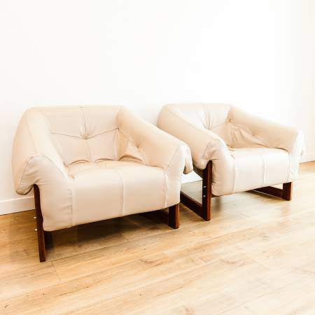 Fully restored pair of MP-93 lounge chairs by Percival Lafer, made in Brazil in the 1970s. The MP-93 offers cloud-like comfort with an upholstered seat cushion that floats in a geometric sled-leg base. Exposed hardware connects the lateral stretcher bars to leg assemblies – a signature element of Lafer design.