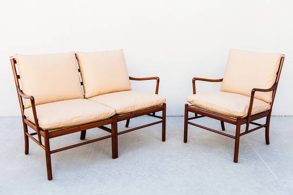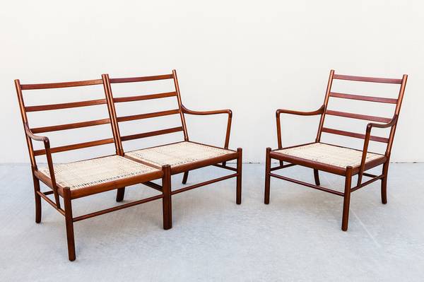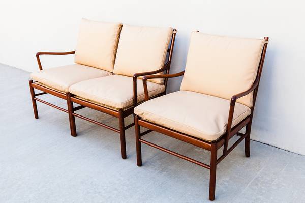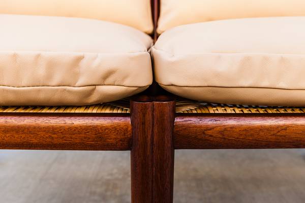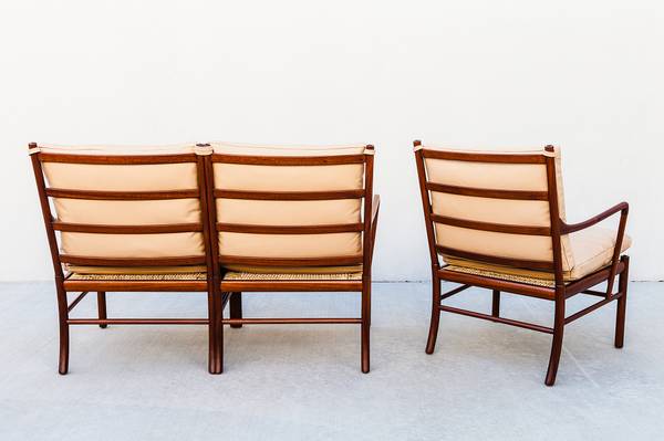 The Colonial Chair and Sofa were originally available in rosewood or mahogany, the latter option possibly reflecting the influence of Wanscher’s mentor, Kaare Klint, whose early sofas and famous Red Chair were produced from a Cuban variety of the wood.