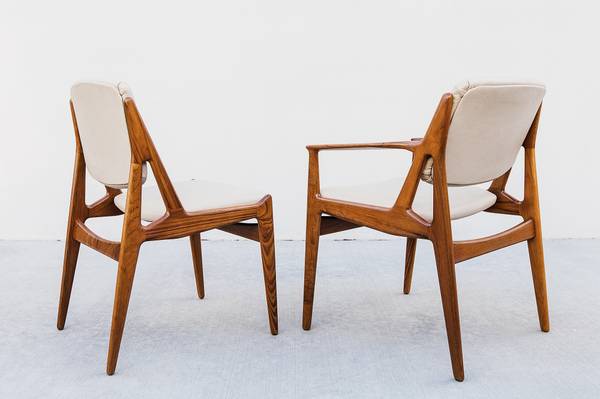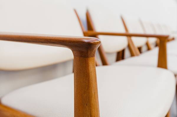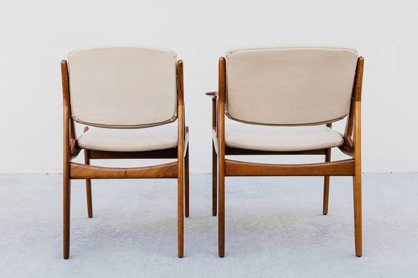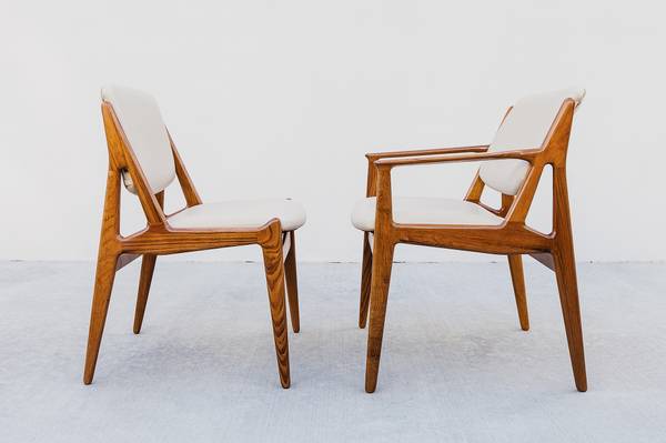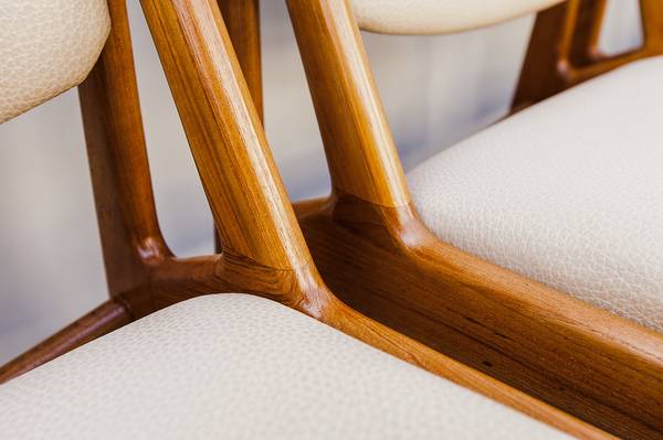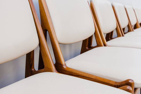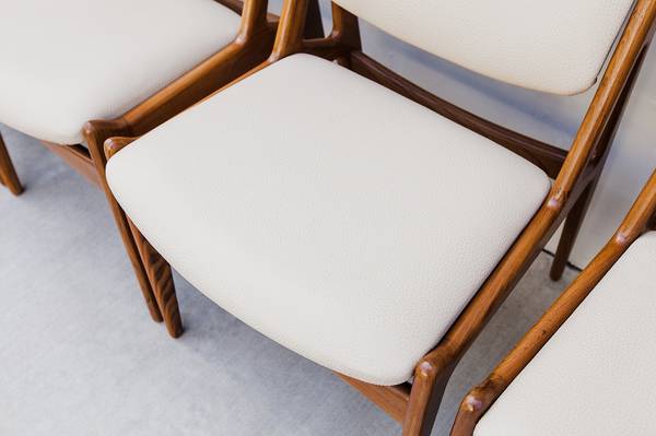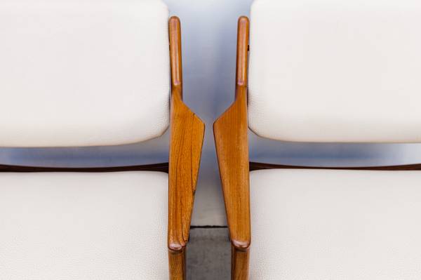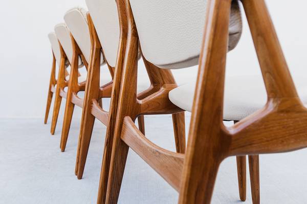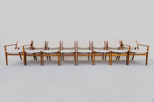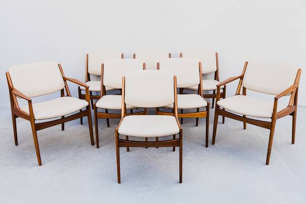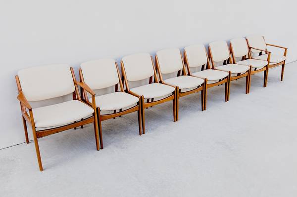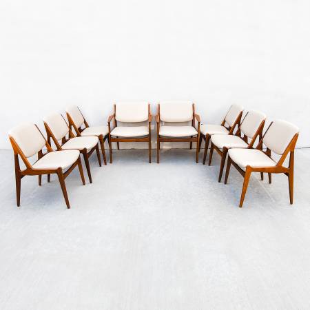 Expertly restored set of 8 mid century modern "Ella" tilt-back dining chairs by Arne Vodder, made in Denmark by Vamo Sonderborg in the 1960s.