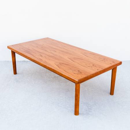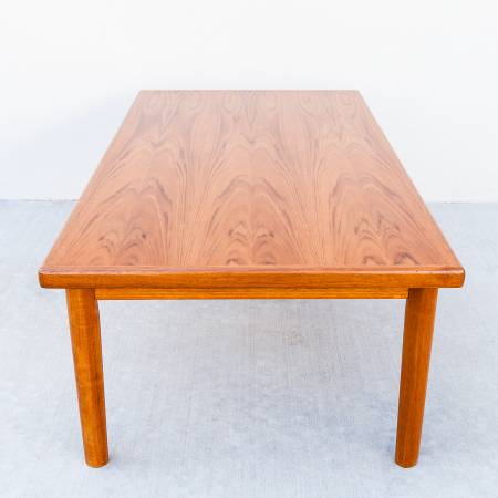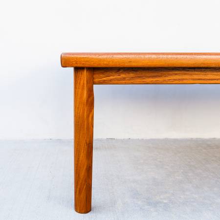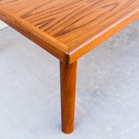 Vintage mid century modern teak coffee table, made in Denmark c. 1970s. Features softly rounded edges with geometric tapered legs. Similar in style to pieces by Vejle Stole from the same time period.