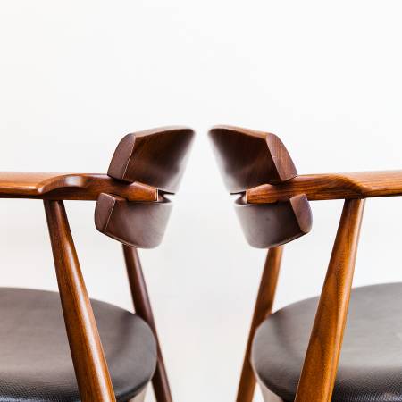 The arms are perfectly sculpted, like the wing of and airplane, evoking those of Finn Juhl's FD 136 and NV 53. Stiletto tapers combined with the sharp angle of the rear legs give them a look that is both dainty and aggressive.