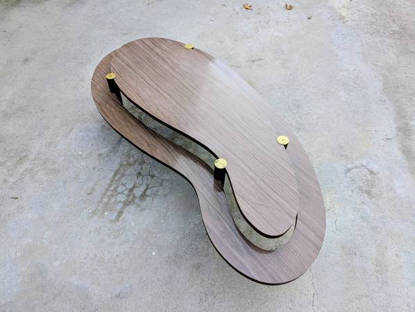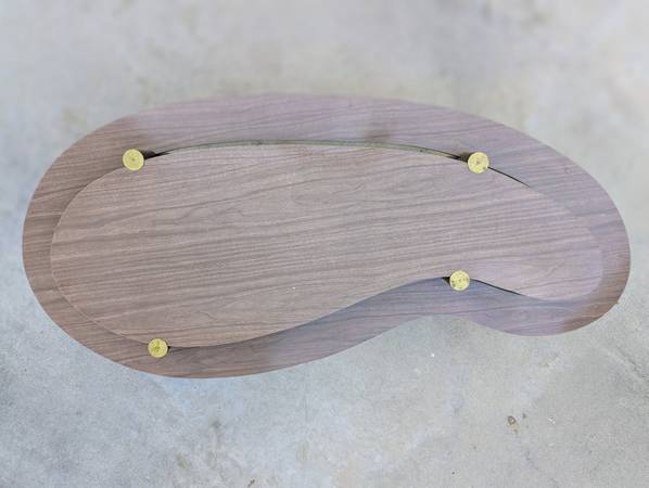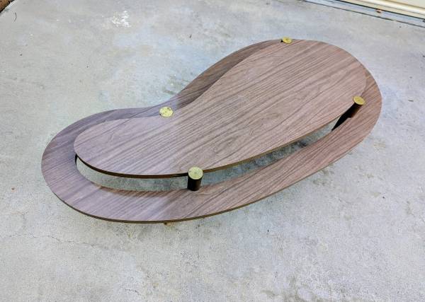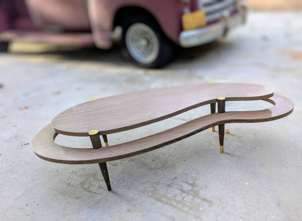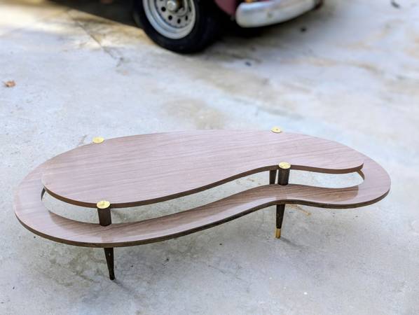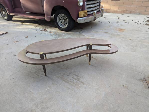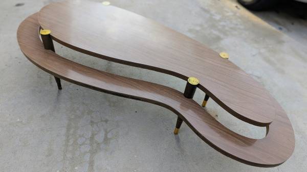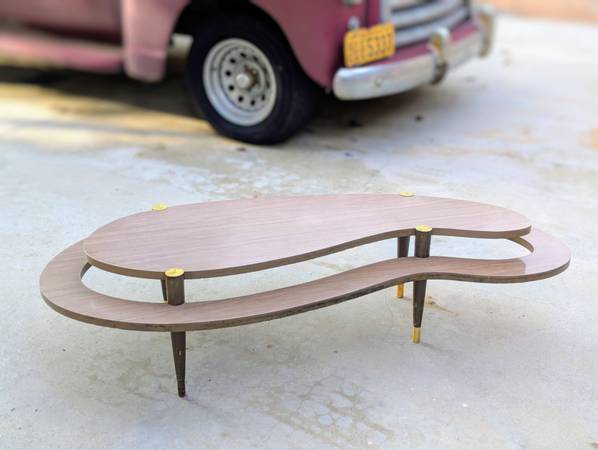 A vintage 1950's/1960's Danish modern Mid-century pallet, kidney shaped coffee table in good condition. 59"x27"x19", It has a two-tier Formica top. Call or text 8 one 8-5 two 4- 88 four 7. Scammers...