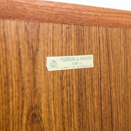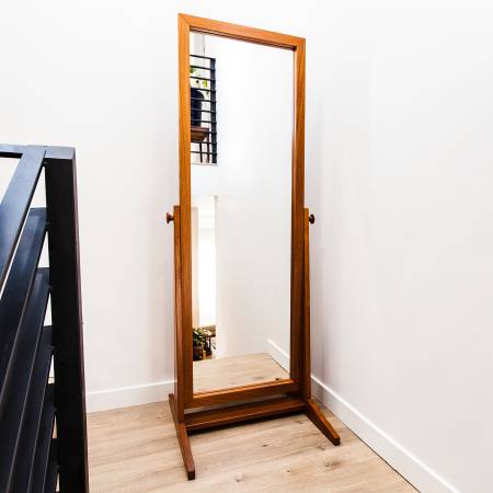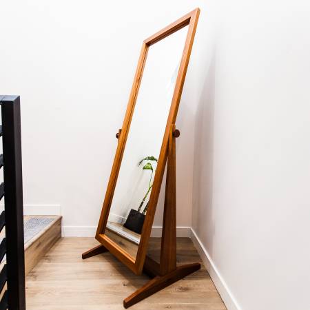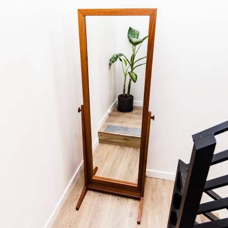 Vintage Danish modern teak standing mirror with geometric base by Pedersen & Hansen c. 1970s. Features an adjustable mirror with tapered teak knobs to lock it in position. The fully finished back allows it to be placed anywhere in the room