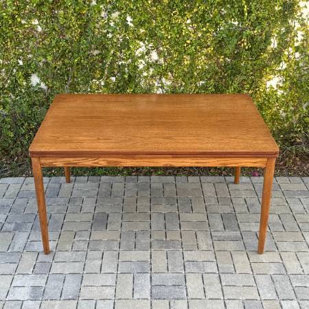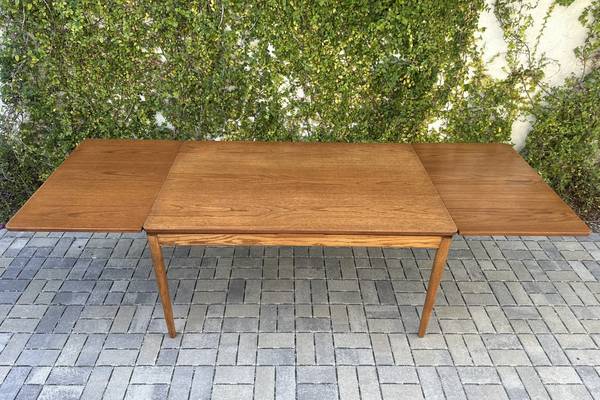 This particular table has an oak frame and tapered oak legs, which contrast nicely with the amber color of the teak surfaces. Teak and oak was a fairly common combination in the 1950s and 1960s, often seen in pieces by designers like Hans Wegner and Borge Mogensen.