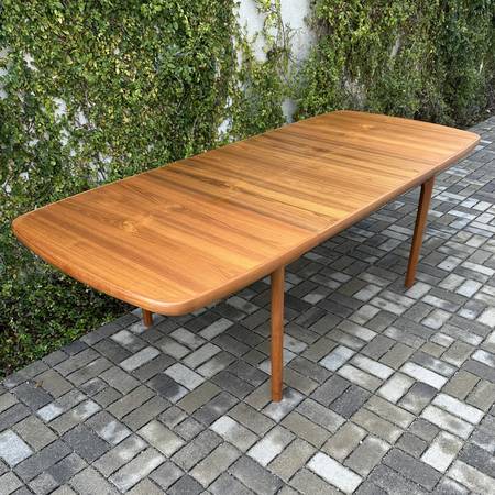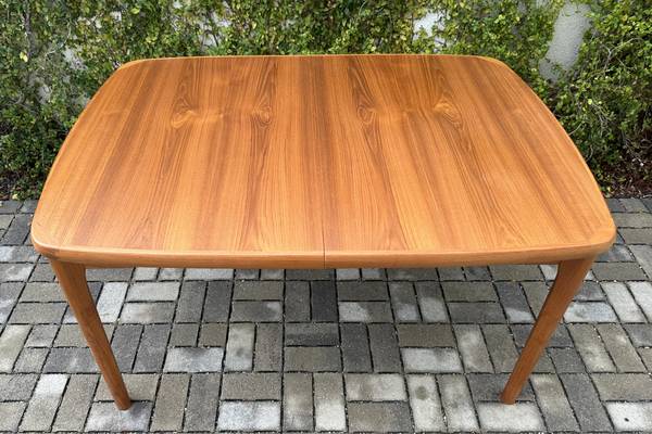 Vintage mid century hidden leaf extension dining table by Ansager Mobler, made in Denmark c. 1980s. This table was used with protective pads since original purchase and remains in incredible original condition.