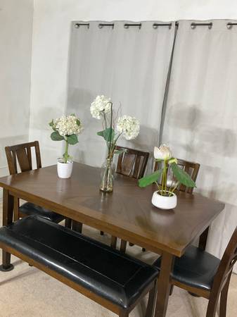 A strong design of bold lines and warm hues, this 6-piece contemporary dining set offers versatility and style. Seamless 3‘ x 5‘ dining table lifted on slightly tapered legs and beautiful inlay pattern. Seating for six include 4 comfortable chairs with intricate backs & faux-leather cushion seats plus matching two-person (41” ) bench. Solid sturdy construction. Great used condition with normal wear. Hablo Español. PRICE IS FIRM