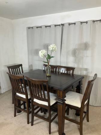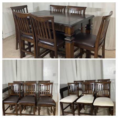 Dark and dramatic, the counter height table is lifted on gorgeous bold legs while 6 matching chairs boast brown faux-leather cushioned seats. Set includes 6 soft, off-white microfiber seat covers for versatility. Solid, sturdy construction. Good used condition with minor ware that adds character and charm. Hablo español.