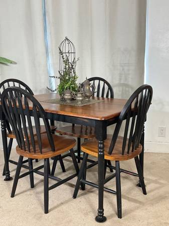 Charming 5-piece dining set crafted from solid wood in modern two-tone finish, Perfect for a kitchen nook or small dining area. Featuring lovely craftsmanship the standard height 2.5’ x 4’ table boasts beautiful turned legs and 4 Windsor style chairs with spindle backs. Solid, sturdy construction. Great used condition. Hablo español.