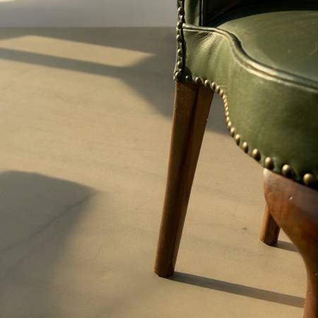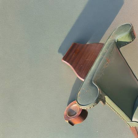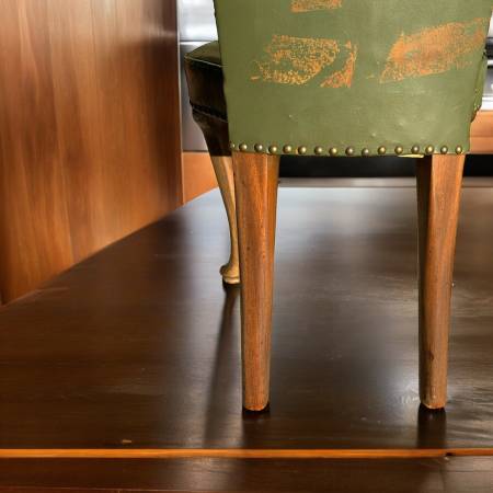 -Distressed green leather upholstery with nail-head trim