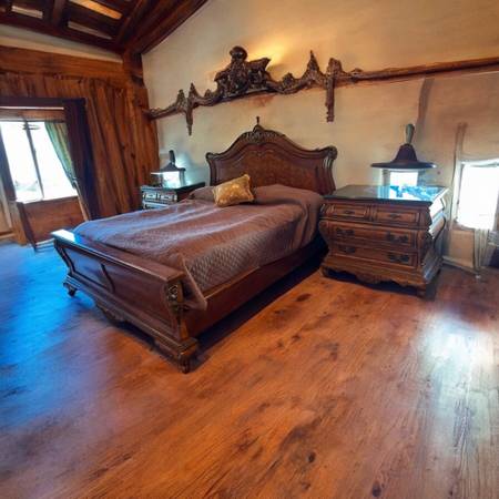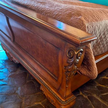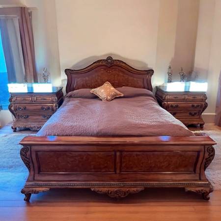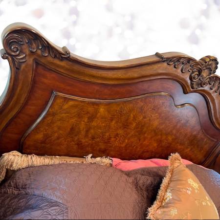 Thomasville bedroom set, traditional wood bed, carved Cal King frame, luxury wood bedroom furniture, ornate nightstands, classic master bedroom set, high end traditional furniture, heirloom quality bed, statement wood headboard, traditional bed set,