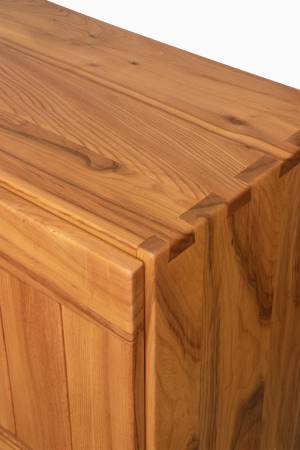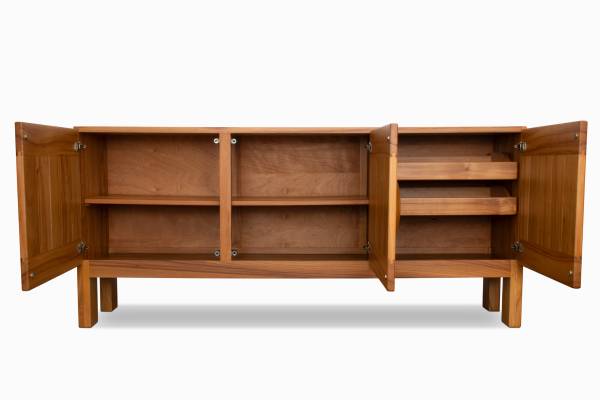 Here is a charming French sideboard/cabinet from Maison Regain, circa 1970s. The solid elm construction features robust dovetail joints, curved handles and stout legs. Two doors on the left reveal a large open space with shelf, while the door on the right allows access to additional storage as well as two sliding drawers. The piece features slightly oversized dimensions at 78" W x 20" D x 35.5" H, giving it a nice presence. It has undergone complete refinishing and is ready for enjoyment.