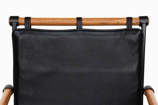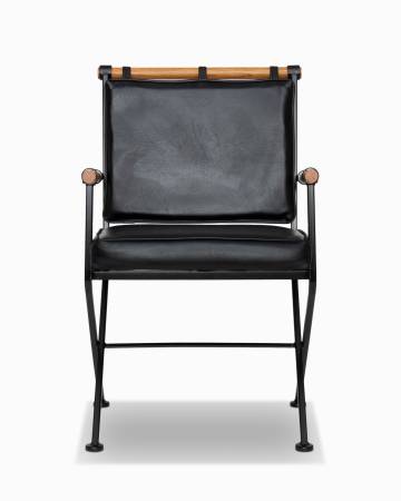 Here is a fantastic set of four campaign style armchairs by Inca Products, attributed to Cleo Baldon. The chairs have been restored with satin black powder coat, refinished oak dowels and new glides. They retain the vintage black vinyl upholstery which is in excellent condition. The rustic, yet modern seventies design features a suspended backrest and very cool "X" style legs. Electronic payment and delivery available. Thank you for looking!