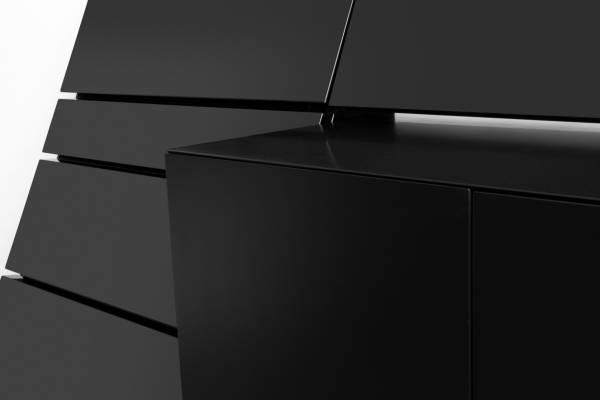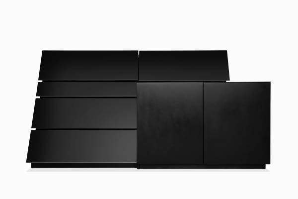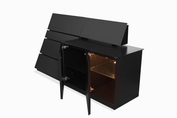 Here is a rare asymmetric sideboard / console by Roger Rougier, circa 1980s. The piece is comprised of two halves - on the left a triangular set of drawers topped by a deep drop-down cabinet in gloss black lacquer; the right consists of a lighted cabinet with adjustable shelving in a matte black finish and another "floating" drop-down cabinet above, which features a built-in silverware holder. It is in excellent vintage condition with only light scratches and minor finish losses. This is more notable on the matte finished cabinet. It is very clean and absolutely ready to stun. The sideboard was purchased from the original owners where it has sat in their Los Angeles estate since 1989. The dimensions are 80" W x 40" H x 23" D. This is postmodernism at its best! Electronic payment and delivery available.
