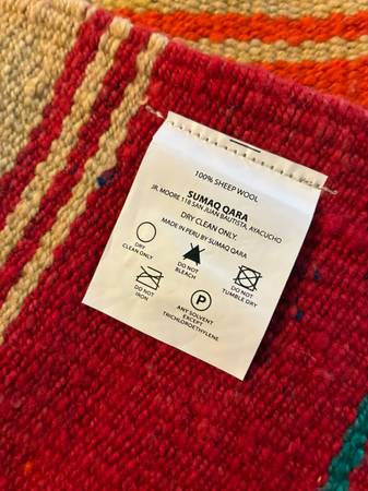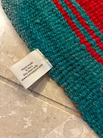 Unique, colorful and one of a kind Sheep-Wool Frazada Rug / Throw Handwoven in the Andes Mountains of Peru by local artisans using traditional weaving techniques and spending many days to create each piece, this local artisans are sponsored and supported by Sumaq Qara (which means “beautiful work” in Quechua) that is based in Peru and is a women-led cooperative that creates stunning handmade accessories while providing fair wages, training, and steady employment to women in marginalized communities.