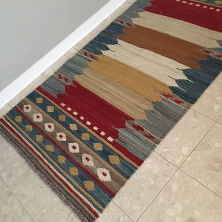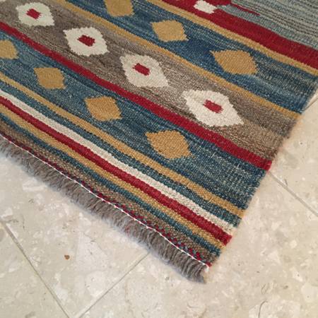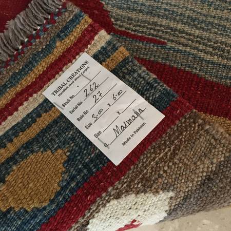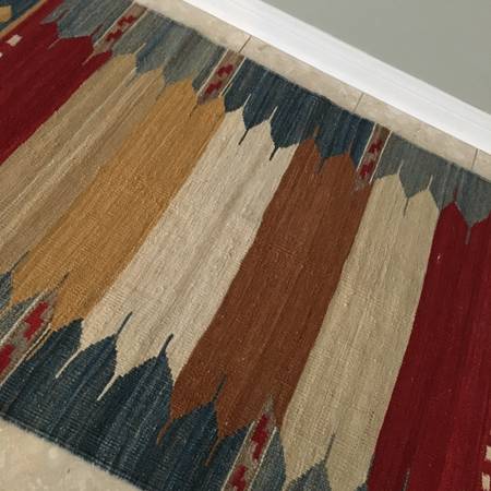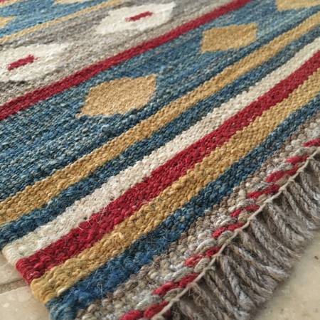 This Rug is Handcrafted from 100% natural Wool that was processed by Hand/Handspan Wool, with a tribal geometric pattern and a modern yet classic/natural feel in shades of red, blue, orange, gray and brown colors and can be used on both sides.