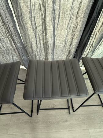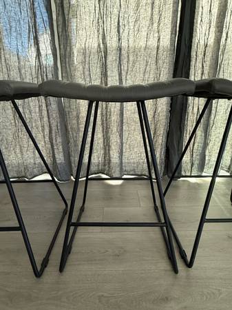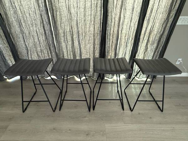 4 grey bar stools Height: 25” Width: 17” Length: 13” FOR PICK UP ONLY!