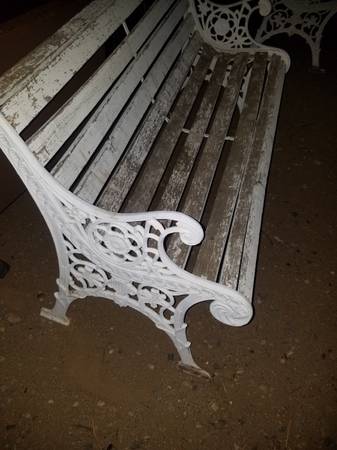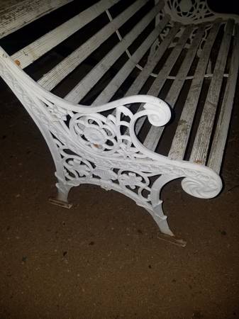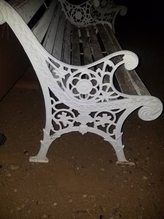 Two vintage park benches. 4' wide. Heavy wrought-iron sides, the wood appears original. They should be tightened up or possibly replace the nuts and bolts. I use them for decoration / yard art. $150 each.