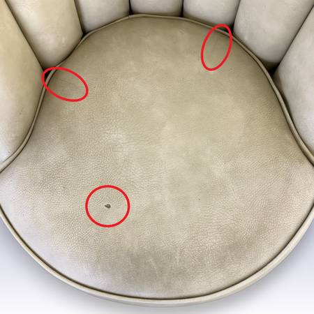 Cushioned/riveted upholstered vinyl seat and back in tan color. The seat has some imperfections (as shown in one picture), but it has no scratches or rips, and it swivels smoothly.
